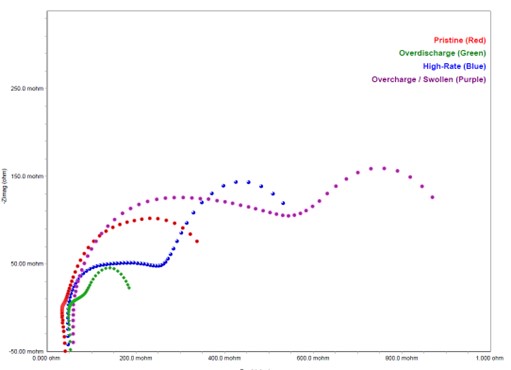 Nyquist plots of (i) pristine (reference) cell, (ii) high-rate cycled cell, (iii) overdischarged cell, and (iv) overcharged cell