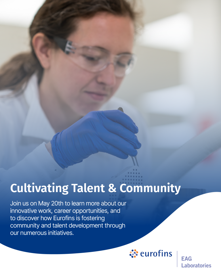 Join us for an engaging virtual info session titled “Cultivating Talent & Community,” hosted by EAG Laboratories in collaboration with our parent company, Eurofins Scientific. As a leading materials science and engineering company, we are excited to open this event to anyone interested in learning more about our innovative work, career opportunities, and to discover how Eurofins is fostering community and talent development through numerous initiatives.